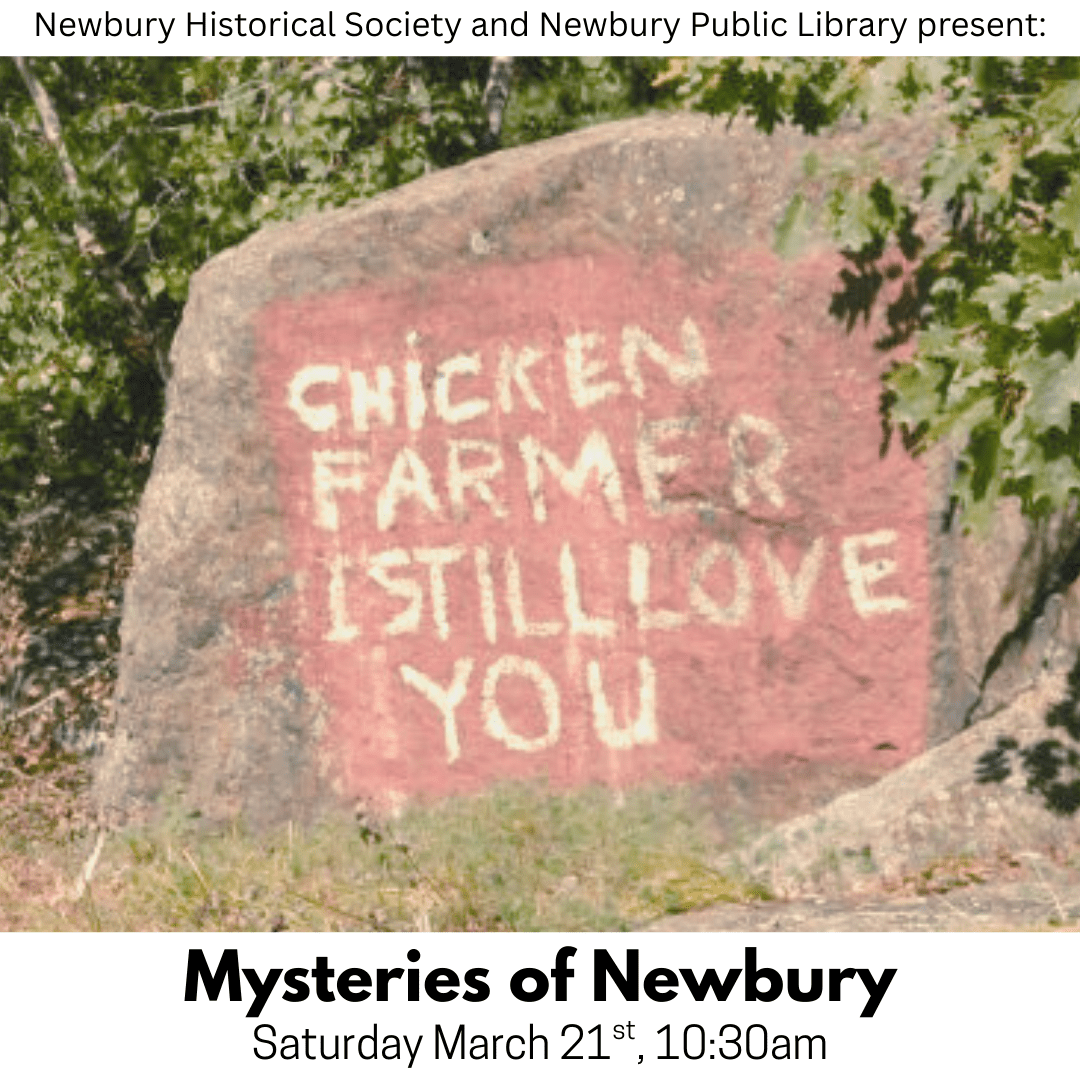 Join Dick Wright and the Newbury Historical Society for a presentation exploring several mysteries in Newbury including Newbury’s Chicken Farmer Rock, the Sunapee Lake Trout, the plane crash at Mt Blood, the discovery of the 1787 Constitution and more!