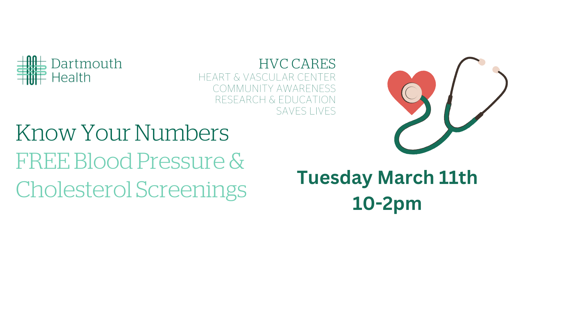 Newbury Library 933 Route 103, Newbury, NH, United StatesThere will be a free screening on Tuesday March 11th (Election Day) from 10-2pm at the library for blood pressure, cholesterol and blood sugar offered by Dartmouth Health/HVC CARES (Heart & Vascular Center Community Awareness Reasearch & Education Saves Lives). Come stop over at the library- screenings will be in our program room!