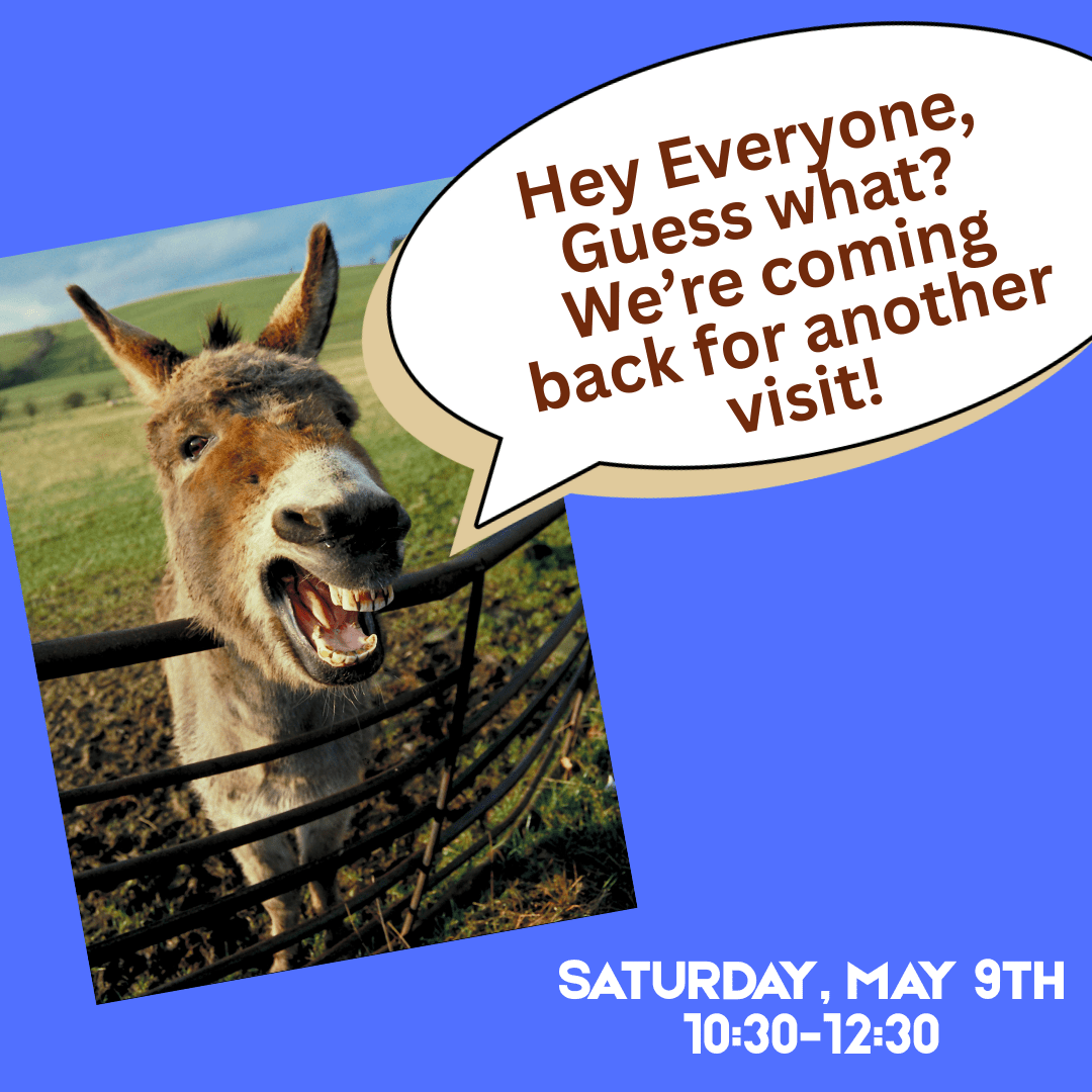 Come walk a donkey, read to a donkey, groom a donkey or just get your fill of Donkey Therapy with the Donkeys from Road to Independence.